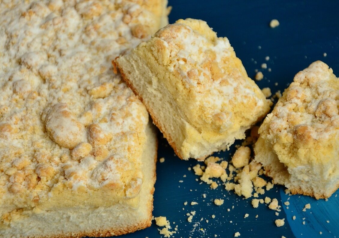 - Using your hands, squeeze the streusel into big clumps and evenly distribute them over the batter.